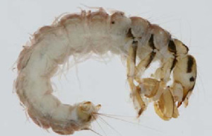 Phryganeidae (Giant case maker) | Retreat: portable case, cylindrical and/or curved, spiraling or ringed layers, often with twigs extending posteriorally; head with dark bands; posternal horn; median sternellum. |