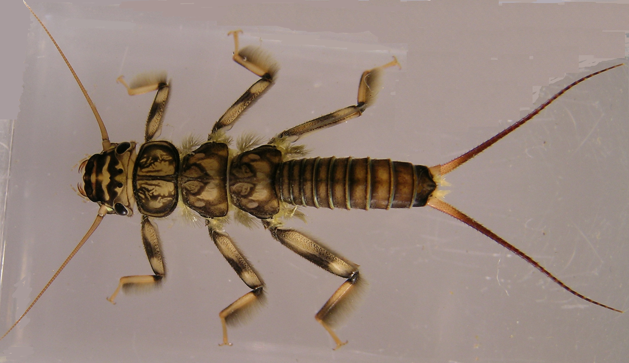 Perlidae (Common Stone) | Head w/variable color patterns; finely branched gills only on sides of throacic segments, never extending to abdominal segments. | Adults often retain remnants of the highly branched gills located around the coxal bases of the nymph. |