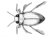 of predaceous diving beetles. Larvae usually have a distinct head, chewing mouthparts, and poorly developed eyes. Wing pads are absent, and thoracic legs are usually present. At maturity, different aquatic beetle species vary in size from 2 mm 60 mm (2 2/5"). Pupae are mummy-like forms that are generally not aquatic. Adults are hard bodied and oval to elongate, with chewing mouthparts and well-developed eyes. The fore wings are hardened covers that usually meet and cover the hind wings and the abdomen. Depending on the species, they can vary in size from 1 mm - 40 mm (1 3/5"). |