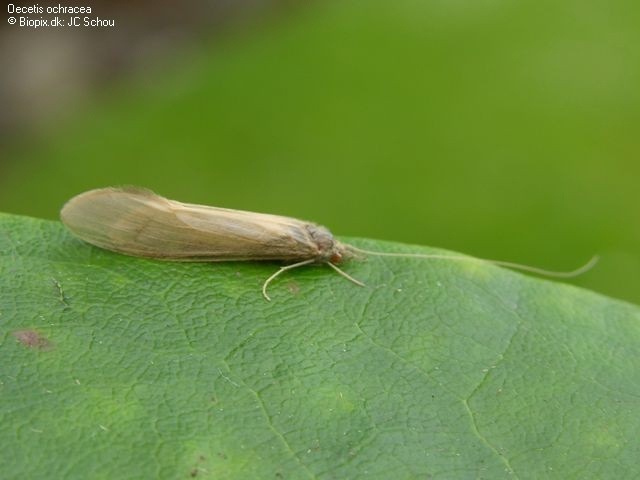 I believe the most likely candidate is a Long-Horn Sedge (Oecetis). Your specimen would fall in the right size range (8-12 mm.), the right wing/body color range (straw yellow to brown), and the right emergence time range (early-summer through late-fall). This is the best photo of an Oecetis adult that I was able to find on the web: